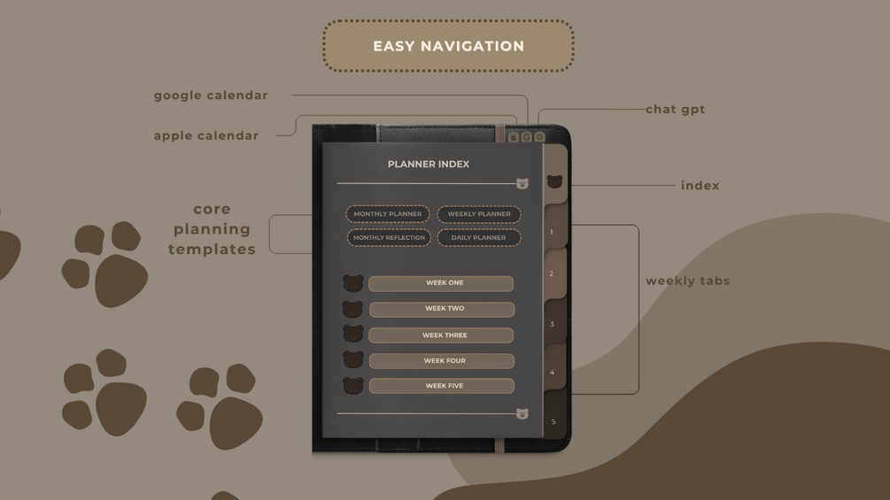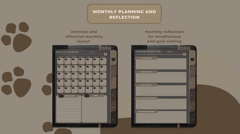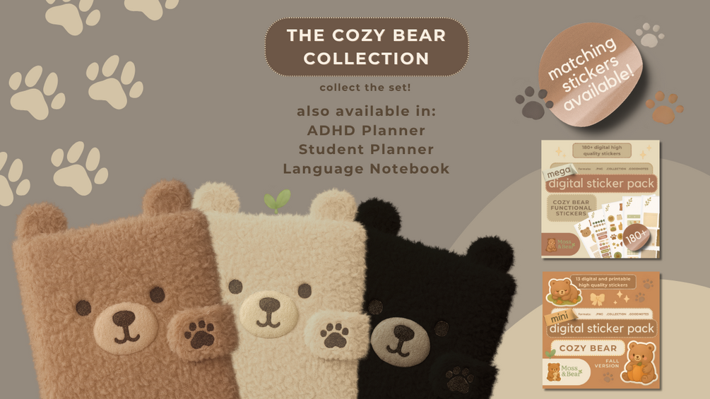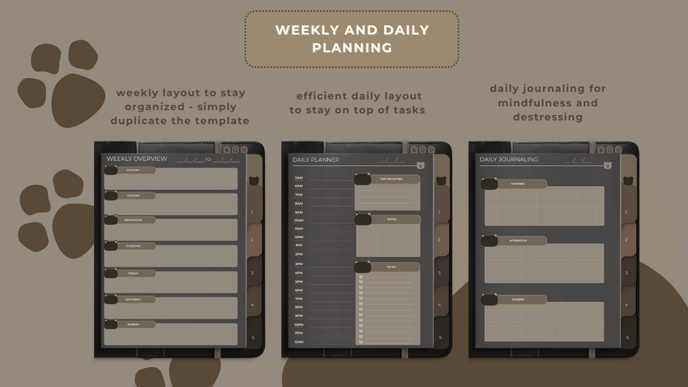 Bring cozy elegance and bold contrast to your digital planning with the Black Bear Edition of the cute bear-themed planner. Featuring a deep brown-black leather-inspired aesthetic and gentle bear details, this planner offers a calming, tactile feel ā like flipping through a notebook, now in sleek grayscale.